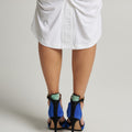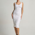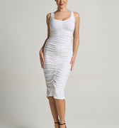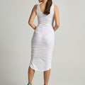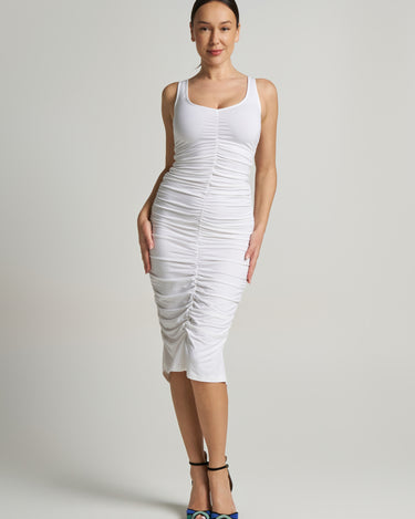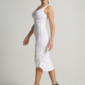 The singlet dress is reimagined with soft ruching, gathered seams and the Liz Skorsis embroidered monogram detail, offering a wardrobe essential with a polished look. Designed with a deep scoop neckline, the Olera Singlet Dress has a mid-calf high-low hemline with a slight flare and is crafted from soft bamboo fabric for that second-skin feel.